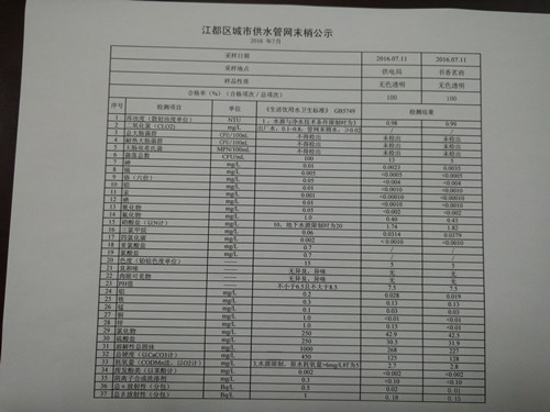 2016年7月江都區城市供水管網末梢公示