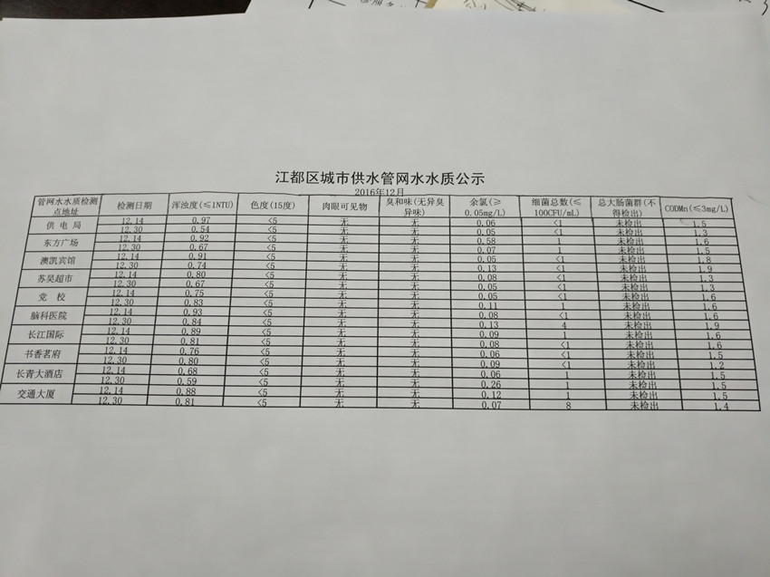 2016年12月江都區城市供水管網水水質公示