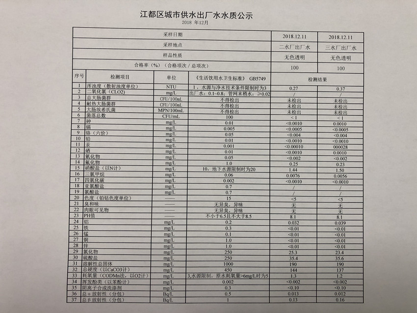 2018年12月江都區城市供水出廠水水質公示