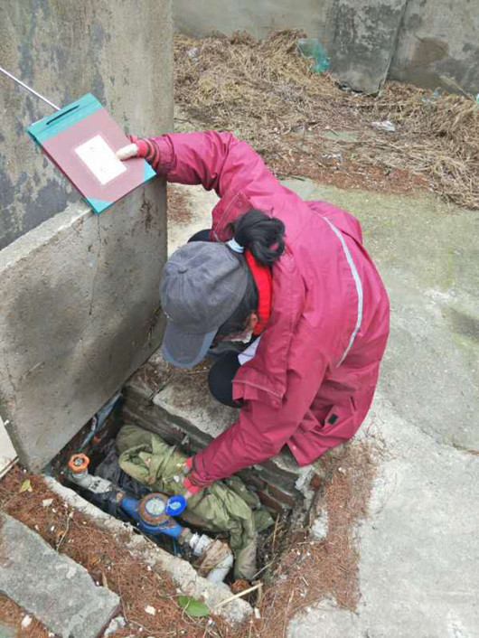 2月21日上午,多云。朱師傅頭戴鴨舌帽,佩戴口罩,膠手套,穿著雨衣,做好個人防護措施,帶著抄收賬簿、分揀好的發票、手電筒、撬棒來到二姜區域,開始“抄收復工”。“你是誰,廠子還沒復工,領導沒來呢!”二姜四方電鍍廠門衛一開始沒認出全副武裝,只露出兩只眼的朱師傅,很警惕。“姜師傅,您好!我是抄表員小朱,來看看急降溫后廠子供水是否正常運行,順便抄表。”朱師傅配合好鞋底消毒和體溫槍測量體溫后,先在廠子里巡查一圈,未發現漏水現象,然后來到廠西南角水表處,她嫻熟地打開水表井,“表深要確保表讀數精確,避免用戶不滿意”,她一邊嘀咕著一邊左手拿出手電筒照明,右手用紙手帕擦拭去水表玻璃上的污垢,認真讀表,確認讀數“7078m³”。