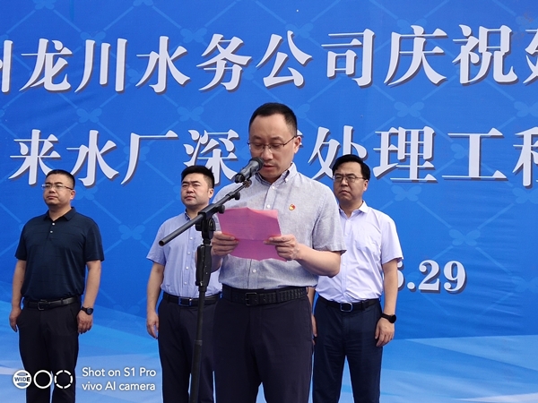 副區(qū)長楊曉榮同志代表區(qū)委、區(qū)政府作重要講話,首先對龍川水務公司第二、三水廠深度處理工程的竣工投運表示熱烈的祝賀,并強調指出,水是經濟社會發(fā)展的重要基礎和關鍵命脈,龍川控股集團委托深圳環(huán)水投資集團運營龍川水務后,水務公司能緊緊圍繞民生所需、民眾所期、民心所盼,大力實施放心水、優(yōu)質水工程,積極推進供水支管網改造和污水管網、農村污水處理設施建設,為全區(qū)水生態(tài)文明建設作出了突出的貢獻,龍川水務公司整體的質態(tài)也有了較大的飛躍。希望以今天的通水儀式為新的起點,不忘初心,牢記使命,乘風破浪,穩(wěn)健前行,進一步推進供水事業(yè)發(fā)展,為江都的社會穩(wěn)定、經濟發(fā)展做出更大的貢獻。